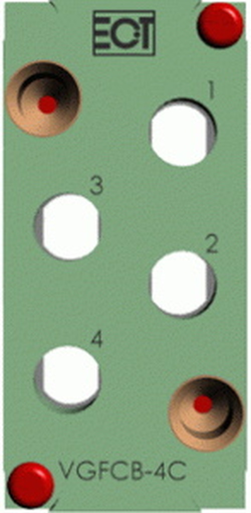 Both the receiver and ITA Adapters will accept flexible, semi ridged and rigid coax cables terminated with an industry standard SMA Plug. Mating block – VGRCB-4CF. Includes: 2 installed bushings 2 screws 4-40 4 holes (without contacts) Impedance 50 Ohms. Fixture contact connection style: SMA. Can be used for all fixtures / receivers with a Pylon™ interface channel. |